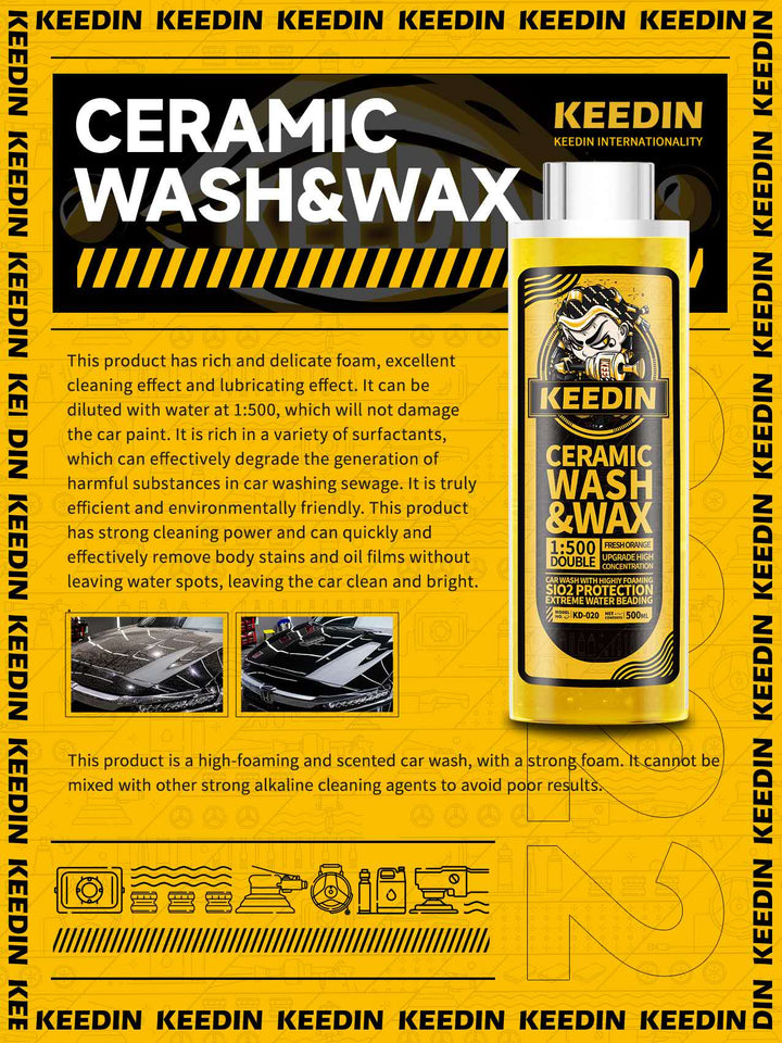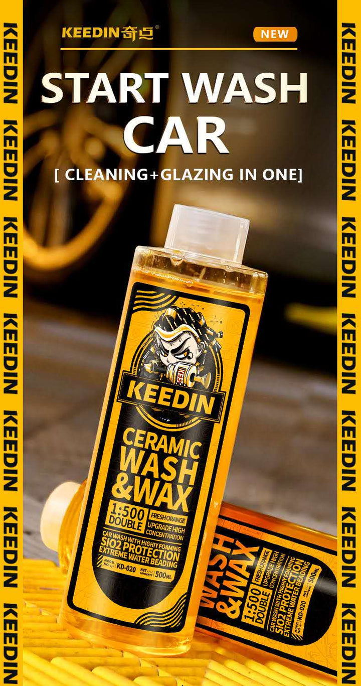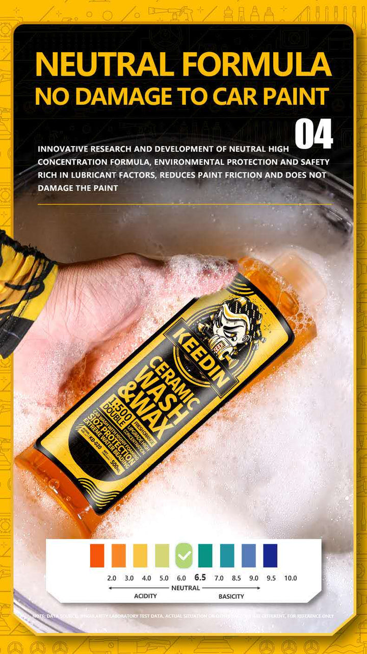 Keedin Ceramic Car Wash & Wax Shampoo is super Hydrophobic & SiO2 create a durable barrier for both coated and uncoated cars that boosts water beading and sheeting, saving time while drying. We infused Sio2 Ceramic ingredients to add protection while washing! Our formula was blended with advanced lubricant that doesnt harm coated, waxed or sealed surfaces. This high foaming, ultra slick PH neutral formula helps prevent wash induced marring! Advanced cleaning formula gently remove road grimes, bugs, dirt and contaminants without harming the surface. Our formula rinses clean without leaving water spots.