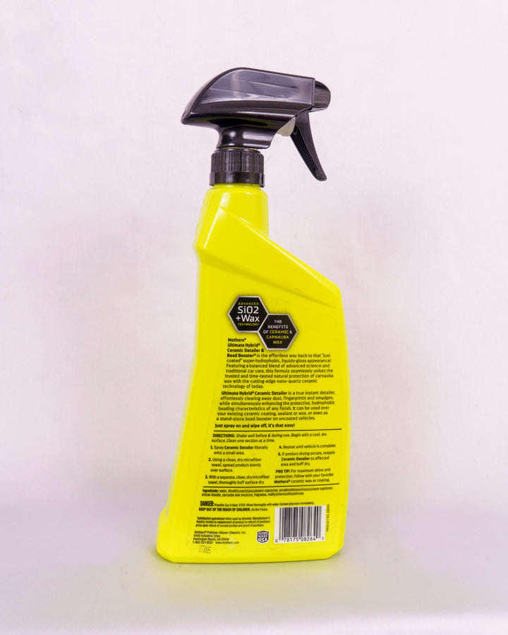 Mothers® Ultimate Hybrid® Ceramic Detailer & Bead Booster® is the e!ortless way back to that “just coated” super-hydrophobic, liquidygloss appearance! Featuring a balanced blend of advanced science and traditional car care, this formula seamlessly unites the trusted and time-tested natural protection of carnauba wax with the cutting-edge nano-quartz ceramic technology of today. Ultimate Hybrid® Ceramic Detailer is a true instant detailer, e!ortlessly clearing away dust, fingerprints and smudges, while simultaneously enhancing the protective, hydrophobic beading characteristics of any finish. It can be used over your existing ceramic coating, sealant or wax, or even as a stand-alone bead booster on uncoated vehicles. Just spray on and wipe o!, it’s that easy!